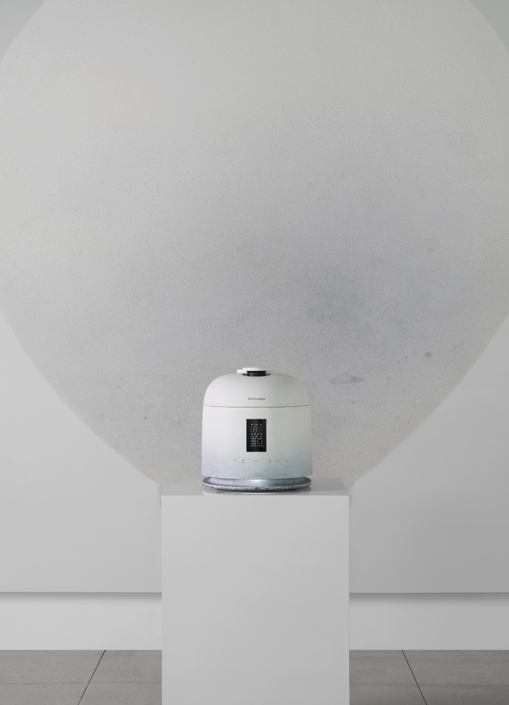 ‘쿠첸 123 최영욱 에디션’은 가전제품을 넘어 공간의 품격을 높이는 프리미엄 인테리어 오브제(Objet)를 지향한다. 이번 프로젝트는 작가의 시선을 통해 일상의 도구가 어떻게 기술과 생활을 넘어 하나의 예술적 장면으로 확장될 수 있는지를 탐구한 결과물이다. 제품 외관은 최영욱 작가 특유의 절제된 미학을 담았다. 달항아리를 연상시키는 부드러운 화이트 톤 바디에 작가의 시그니처인 '카르마(Karma)' 패턴을 은은하게 새겨 넣었다. 특히 ‘123 밥솥’ 하단부에 적용된 '히든 라이팅' 기술로 은은한 빛을 발산하며 공간에 따뜻한 무드를 더한다. 빛과 그림자를 머금은 달항아리처럼, 이 제품 역시 공간 속에서 고요하면서도 존재감 있는 오브제로 자리한다.