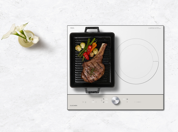 [CUCHEN Free Induction (2 Free Zones + 1 Highlight Burner)]The CUCHEN Free Induction is a product that combines 2 free zones and 1 expanded highlight burner. With the free zone configuration that automatically adjusts to the pot size and an extended dual highlight setup, it allows for convenient use with large cookware. Equipped with smart wheel control (Direct Touch + Wheel Touch) and five unique Korean-style chef functions (Heating, Pan, Simmering, Keep Warm, Boiling), it offers advanced functionality.